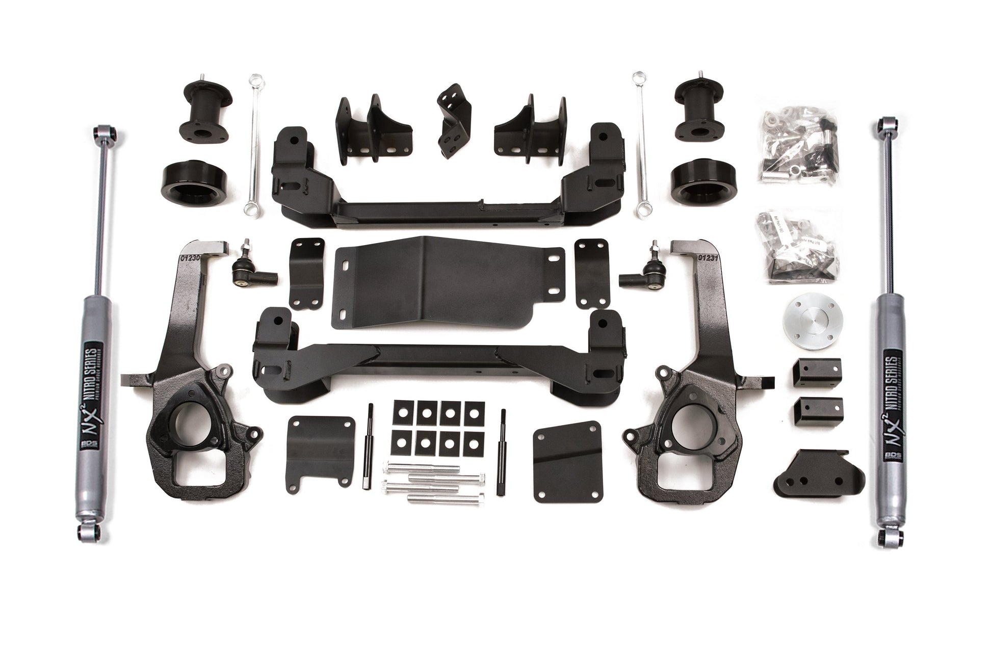 This kit takes advantage of BDS's tried and true high-clearance design for improved ground clearance, strength, and offroad protection while correcting suspension and steering geometry for great on-road handling characteristics. Up front, the kit utilizes top mounted strut spacers, high-arched 1/4-inch thick steel crossmembers along with a multipiece differential relocation brackets and heavy duty skid plates built for offroad protection. Steering geometry is corrected at the new taller ride height with CNC-machined ductile iron steering knuckles and replacement tie rod ends allowing for ESC system compatibility. These combined with the provided sway bar drops, bump stop extensions, stainless steel braided brake lines, CV spacers, supplied hardware and more provide a comprehensive front suspension lift ready for whatever you throw at it.