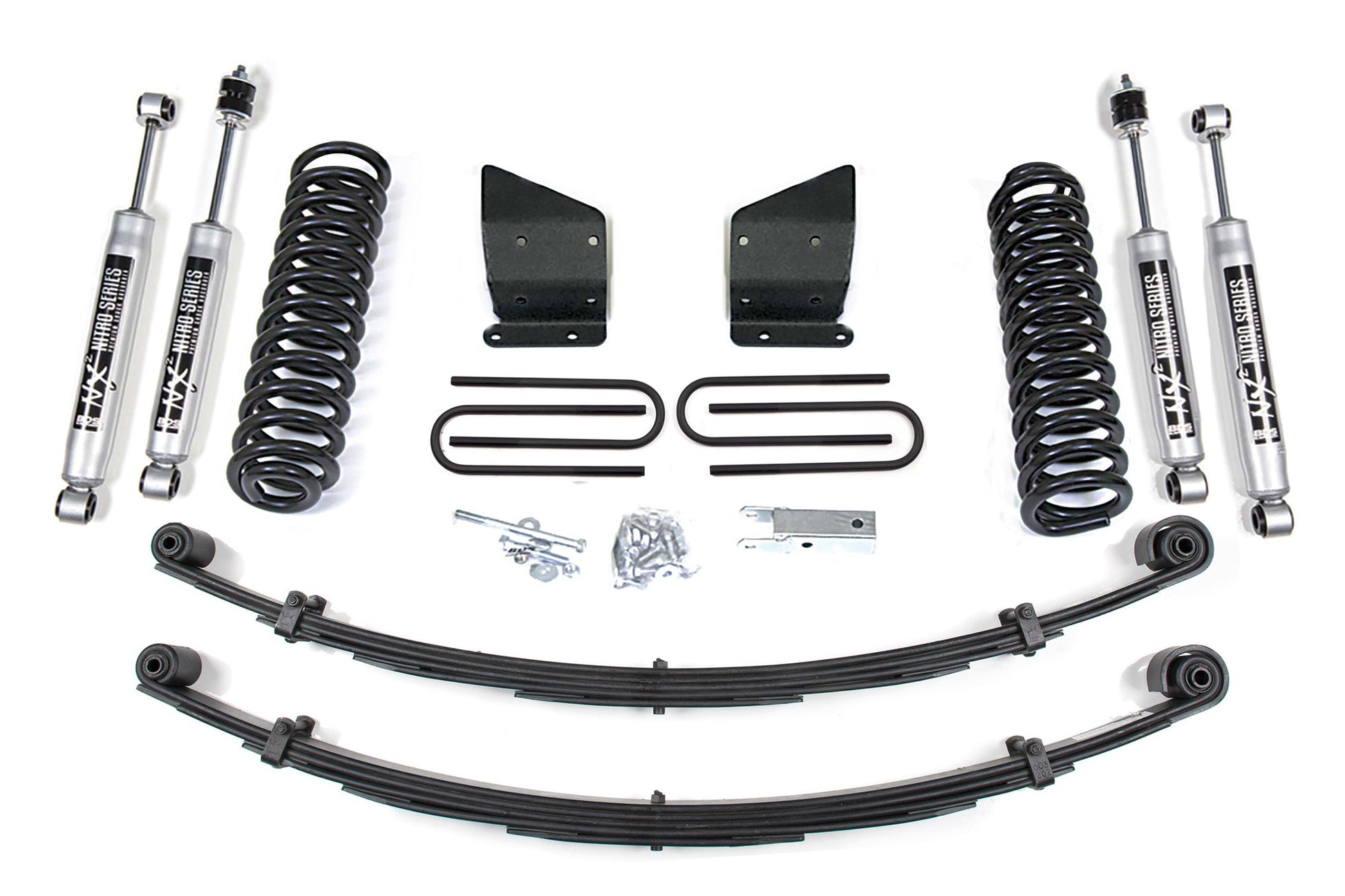In the rear the base kit utilizes a high-strength lift block, longer u-bolts and a matching set of NX2 Nitro shocks.
