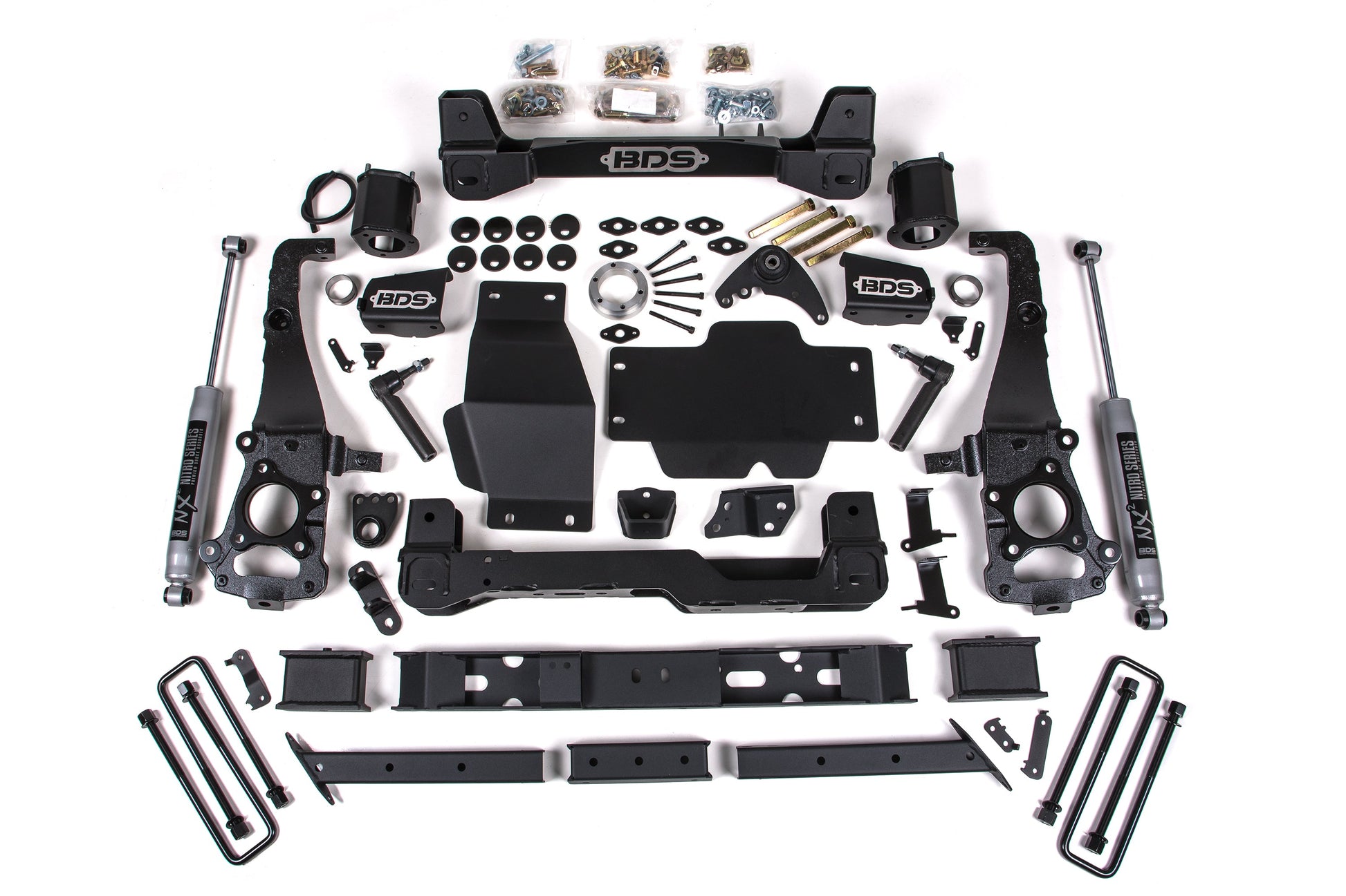 In the rear BDS utilizes a heavy duty replacement transfer case cross-member, high strength fabricated lift blocks and longer u-bolts to lift and level the stance along and NX2 Nitro or optional FOX 2.0 Performance Series shocks.