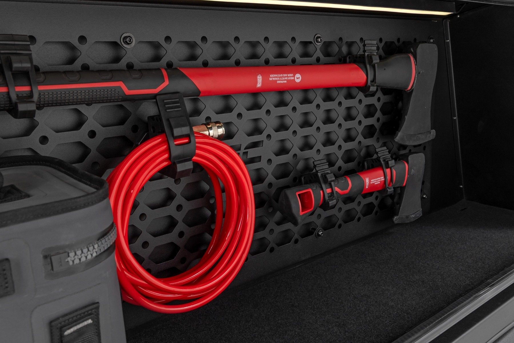 Rugged Durability: Built with a tough powder-coated finish to resist wear and corrosion.\ Versatile Storage: Unlimited accessory attachment options behind a secure gullwing door.\ Hassle-Free Install: Designed for quick and easy installation with minimal effort.\ Integrated Interior LED Strip: Interior-mounted LED lighting for enhanced visibility in low-light conditions.\