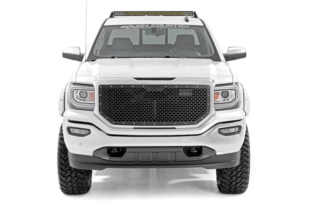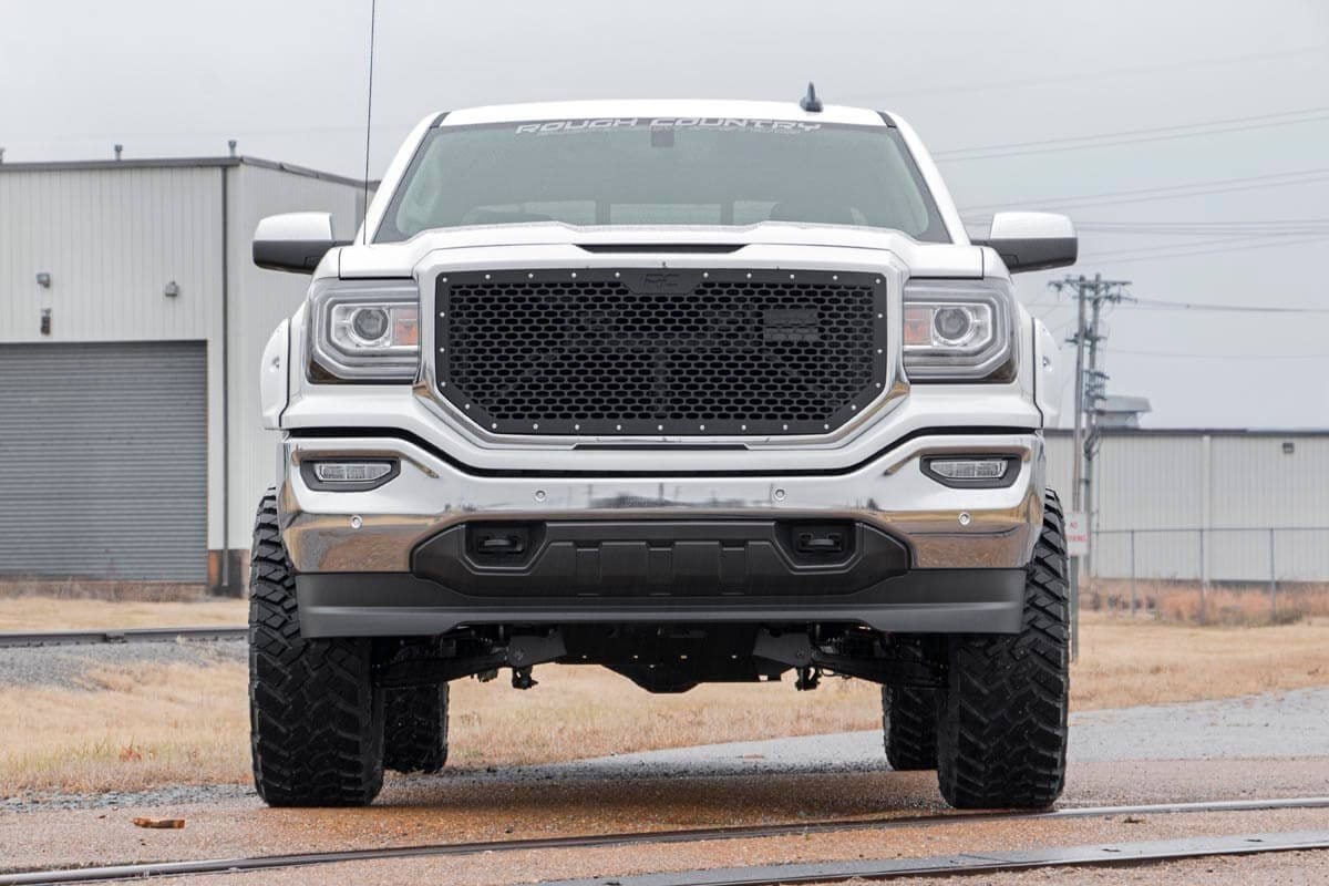 Give the front-end of your GMC 1500 a unique look with Rough Country's Mesh Grille kit. This grille replacement kit swaps out your stock grille with the eye-catching, head-turning good looks of this aftermarket upgrade. With a unique, laser-cut mesh pattern surrounded by stylish, stainless steel rivets, this grill gives your truck a more menacing look that's sure to draw attention. Each kit is powdercoated black to resist corrosion and give a long lifespan of good looks.